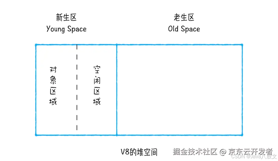 基于此,V8 将堆内存分为新生代和老生代两个区域。新生代存放生命周期短的对象,老生代存放生命周期长的对象。V8 的垃圾回收器分为主垃圾回收器和副垃圾回收器。