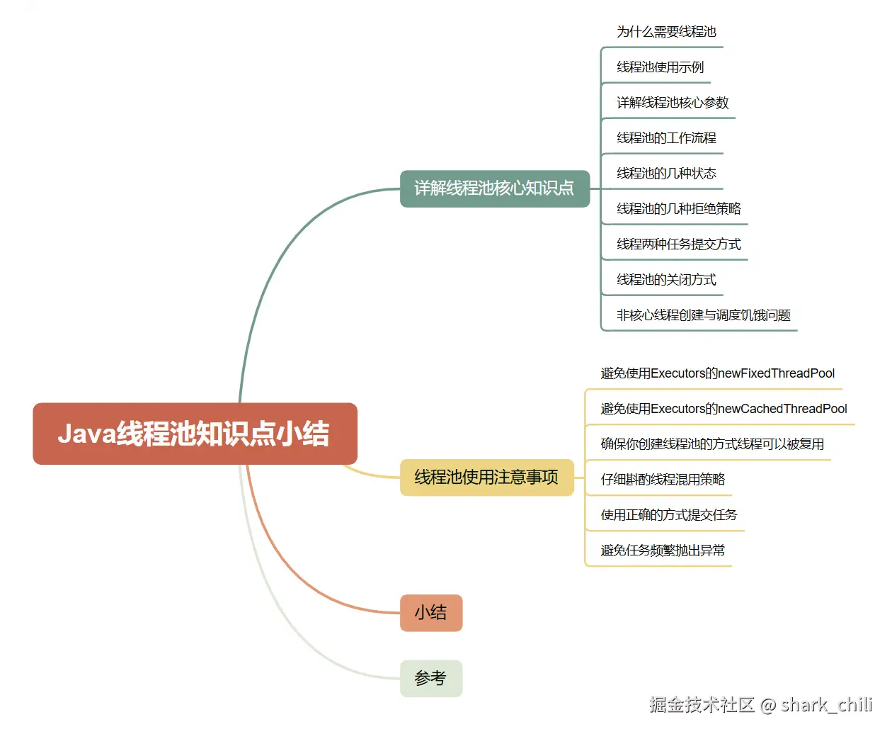corePoolSize:核心线程数,即时空闲也会保留在线程池中的线程。maximumPoolSize:线程池允许创建的最大线程数,例如配置为10,那么线程池中最大的线程数就为10。keepAliveTime:核心线程数以外的线程的生存时间,例如corePoolSize为2,maximumPoolSize为5,假如我们线程池中有5个线程,核心线程以外有3个,这3个线程如果在keepAliveTime的时间内没有被用到就会被回收。unit:keepAliveTime的时间单位。workQueue:当核心线程都在忙碌时,任务都会先放到队列中。threadFactory:线程工厂,用户可以通过这个参数指定创建线程的线程工厂。handler:当线程池无法接受新的任务时,就会根据这个参数做出拒绝策略,默认拒绝策略是直接抛异常。
