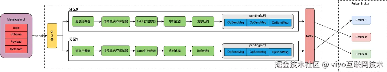 Pulsar 使用netty将消息异步的从客户端发送到服务端,Broker节点将在收到消息后对其进行确认,并将其存储在指定主题的持久存储中。