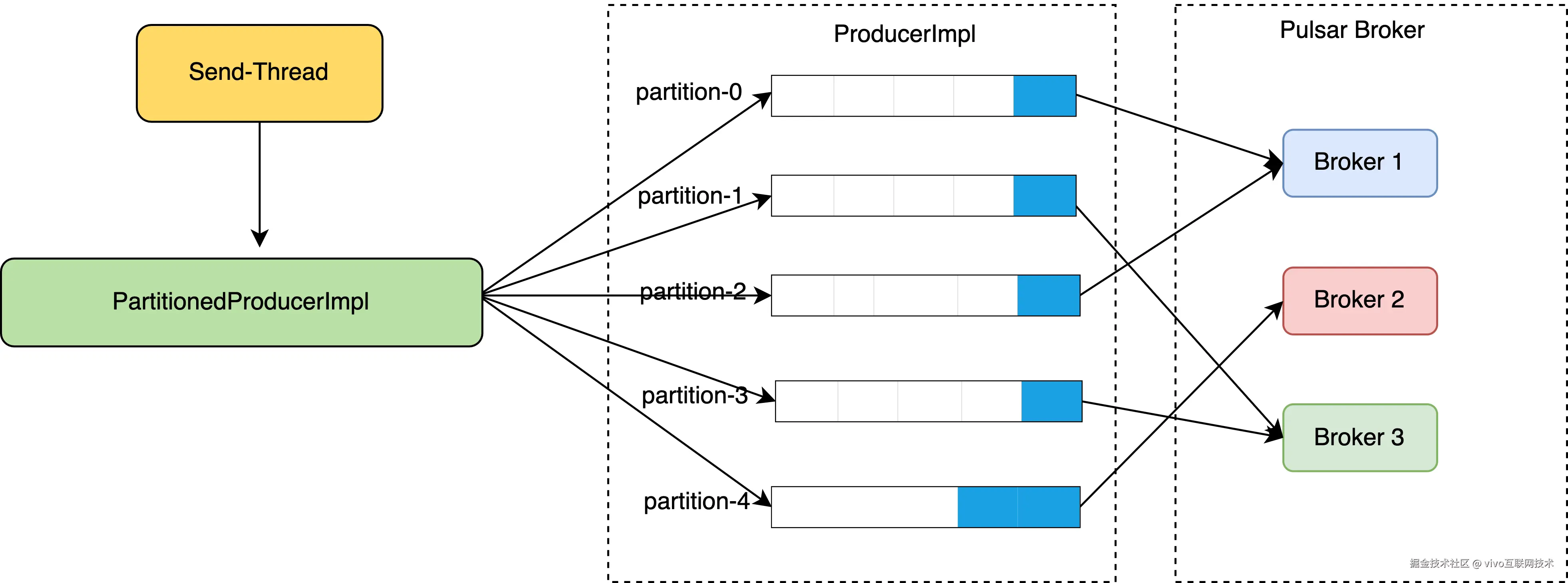 在Pulsar中,PartitionedProducerImpl用于将多个ProducerImpl对象包装成为一个逻辑生产者,以便向Partitioned Topic发送消息时能够批量操作。其中,PartitionedProducerImpl.producers成员变量维护了每个分区及其对应的ProducerImpl对象,该设计主要有以下3个好处: