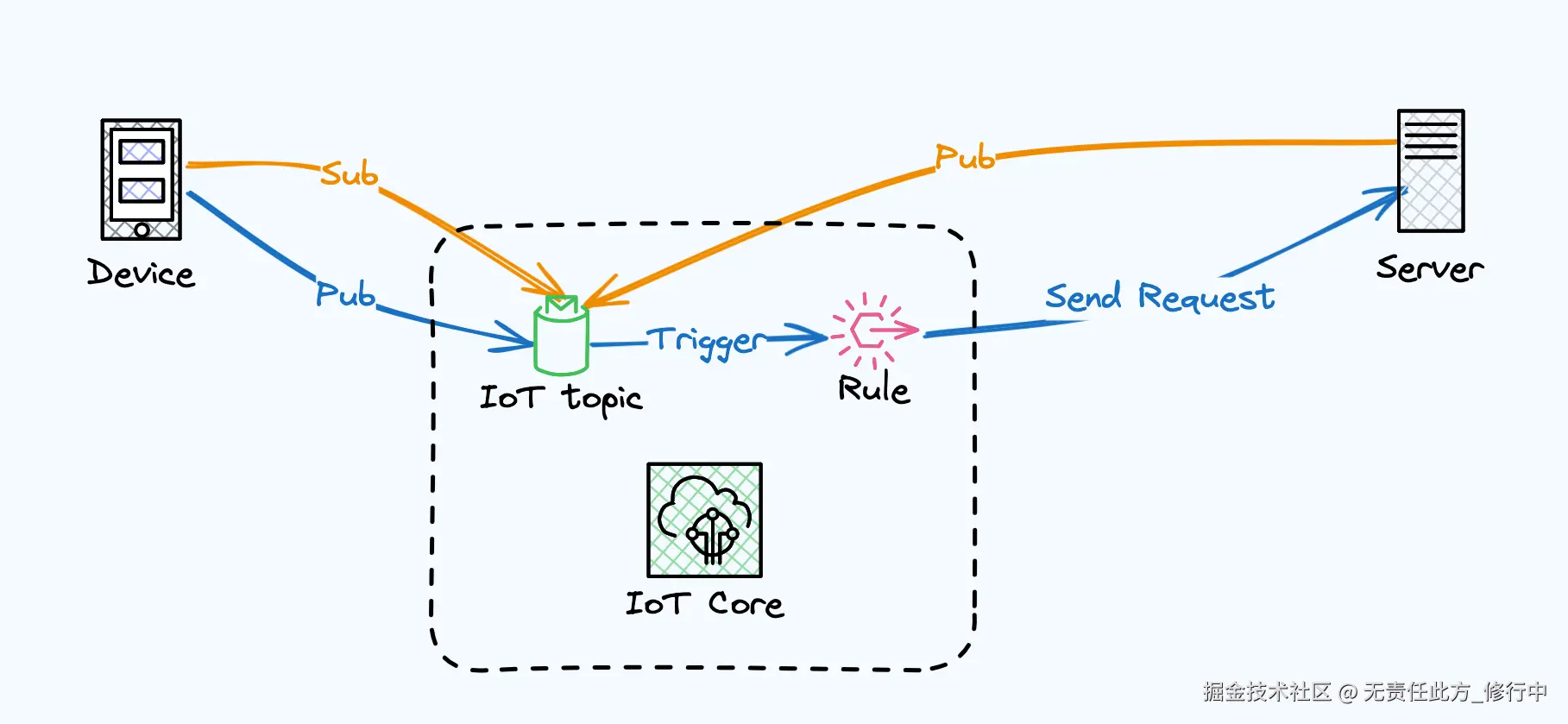 - 下行路径(橙色):后端服务 -> AWS IoT Core -> 设备