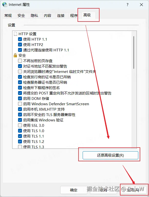 2. 重置Intern设置 打开 Internet 选项,找到高级,然后点击还原高级设置-->应用。 实测在防火墙开启时,该修改方案依然有效。