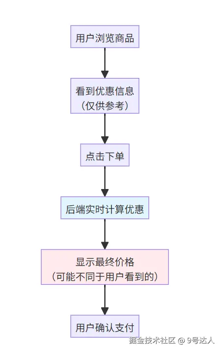 核心流程:用户看到优惠 → 下单时校验 → 优惠变化时提示用户