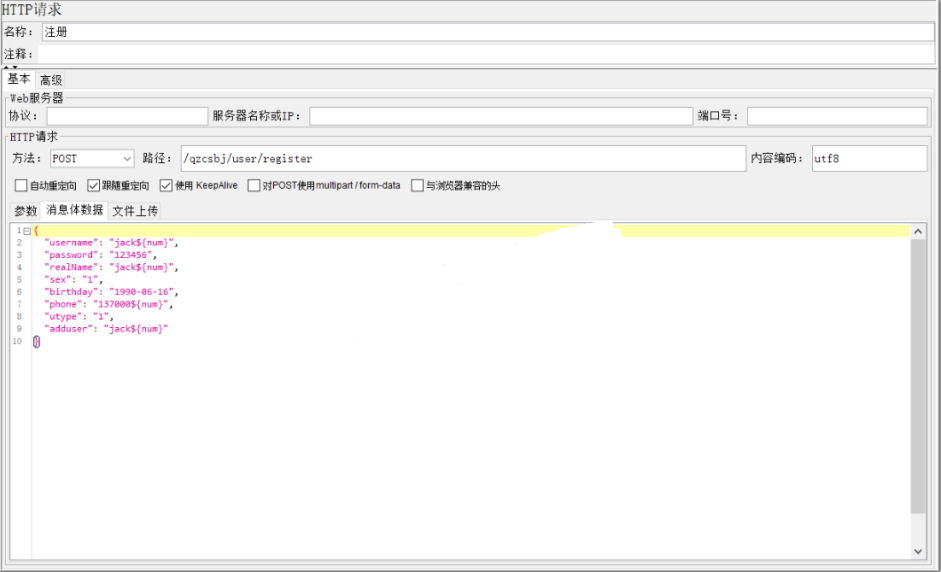 通过计数器,可以造指定格式的数字,然后和前缀字符串拼接形成参数值,比如username,前缀都是jack,计数器生成5位,拼接后就是jack0000001、jack0000002这种