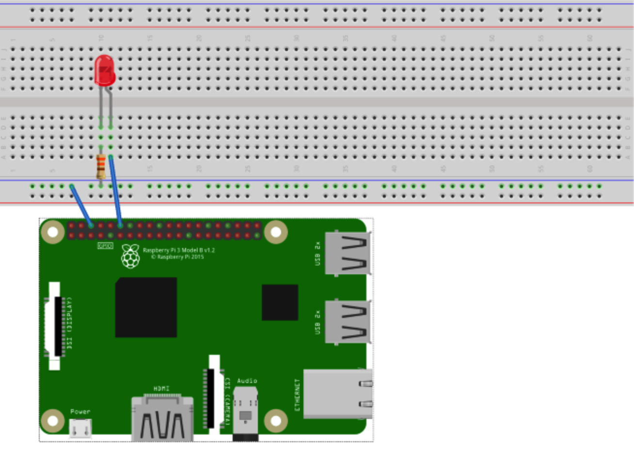 - LED 阴极(较短、负极导线)到 330 Ω 电阻器(任一端)