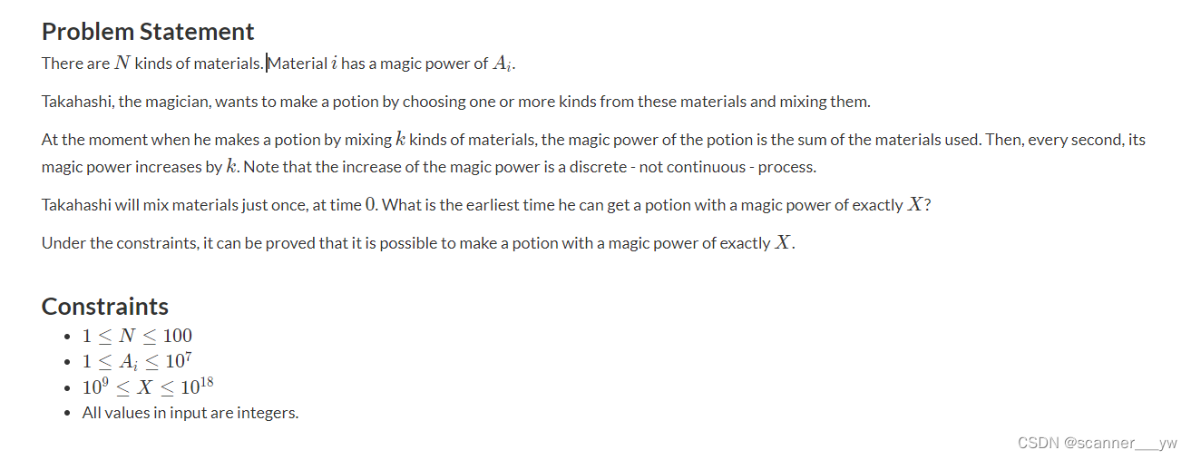 给你k个材料,和一个能量x,每个裁量都有一个能量,高桥先生能任意拿k个材料,并且把他们合起来,最后必须要保证能到x,(注意k个材料合成后,每秒会有k的能量生长),请问最少的时间是多少?