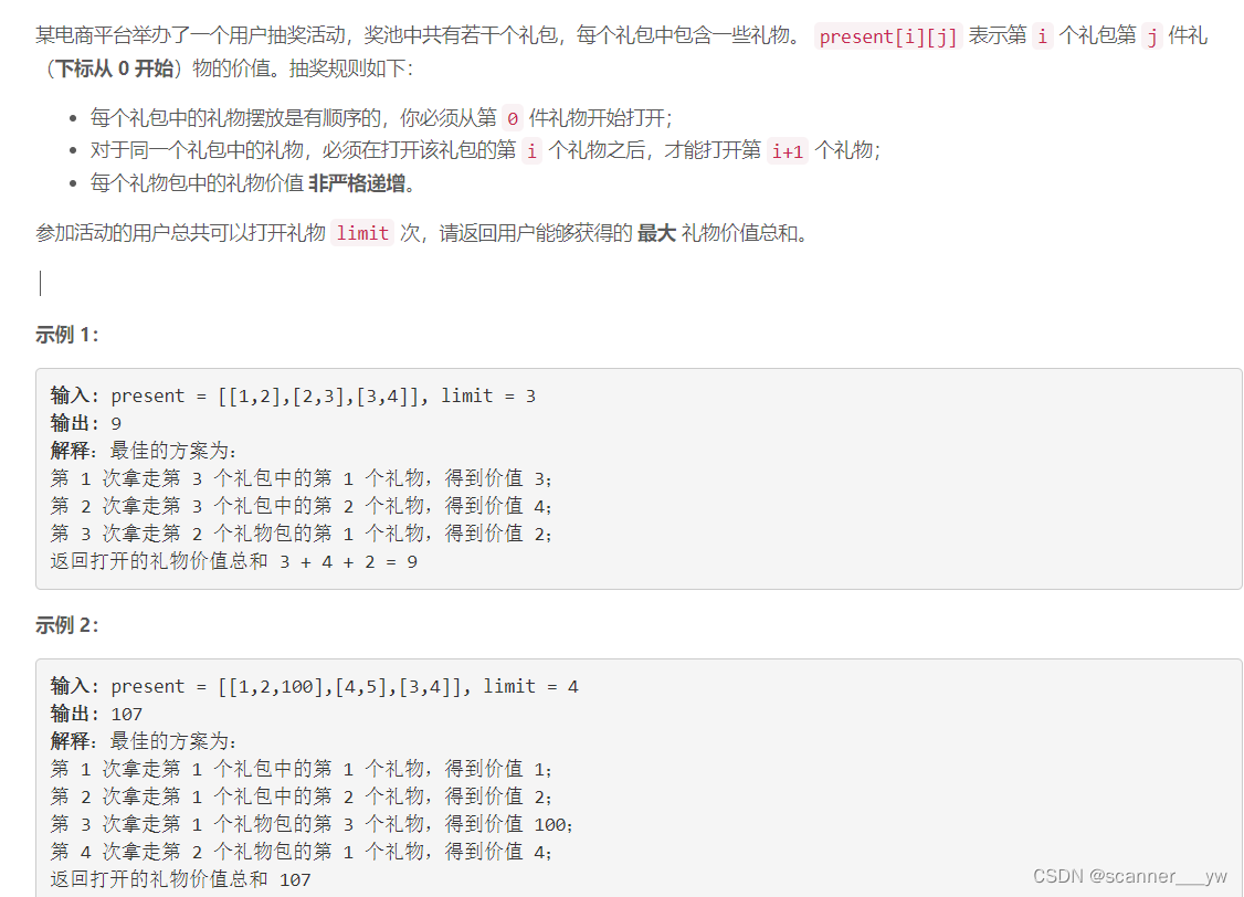 首先我们需要发现一个贪心的性质,就是我只要取这个包,那我一定要尽可能拿完,也就是说我们可以把每个礼包看作一个整体,做一个01背包,但是这里又有一个limit,而且礼包大小不相同,因此我们需要考虑拿完一些整的背包后,剩下的该拿哪一个。如果直接枚举会是n*n*limit,我们想我们肯定要枚举最后一个这是跑不掉的,但是我们枚举的过程dp是不是可以优化一下呢?因为我们如果计算左边的背包,那么我们枚举右边区间的时候,实际上上只需要加上左边背包的价值,因此这题的思路就是贪心+分治优化01背包。