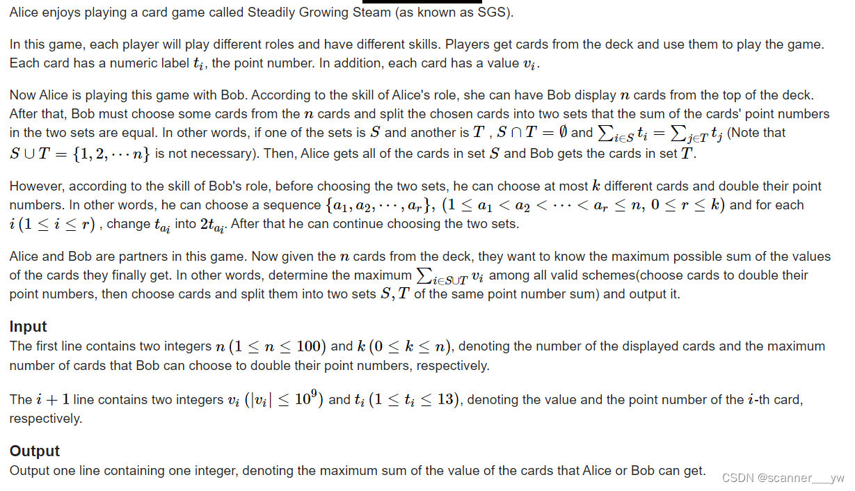 给定你一串牌,每张卡都有一个数字标签ti,即点数。此外,每张卡都有一个值vi。鲍勃必须从这n张牌中选择一些牌,并将所选的牌分成两组,使两组中的牌的点数之和相等。然而,根据鲍勃的角色技能,在选择这两组牌之前,他最多可以选择k个不同的牌,并将它们的点数加倍。换句话说,他可以选择一个序列{a1,a2,⋯⋯,ar},(1≤a1<a2<⋯⋯<ar≤n,0≤r≤k),对于每个i(1≤i≤r),将tai变成2tai。之后他可以继续选择这两组。他们想知道他们最终得到的牌的价值的最大可能的总和。换句话说,在所有有效方案中确定最大的。