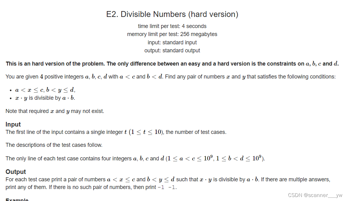 给你四个数a,b,c,d,现在需要让求一个x和y,满足a<x<=c,b<y<=d,并且xy % ab==0。