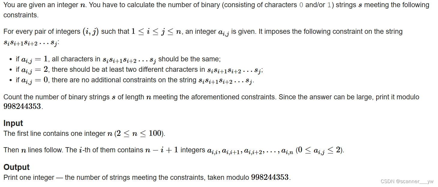 给你一个正数n,你需要去计算满足一下条件的字符串(只有0和1)的数量,对于每一对(i,j)// 0表示无所谓,1表示相同,2表示有两个不相同。