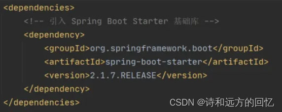 比如我们要创建一个 web 项目,使用 Spring 的朋友都知道,在使用 Spring 的时候,需要在 pom 文件中添加多个依赖,而 Spring Boot 则会帮助开发着快速启动一个 web 容器,在 Spring Boot 中,我们只需要在 pom 文件中添加如下一个 starter-web 依赖即可。