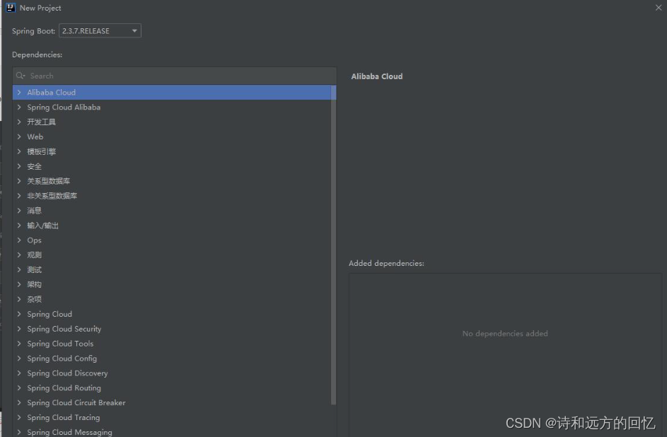上一步填写完信息后点击Next,进入选择依赖库界面,在这里大家就可以选择我们开发当中要使用到的例如数据库驱动,技术,框架等等。