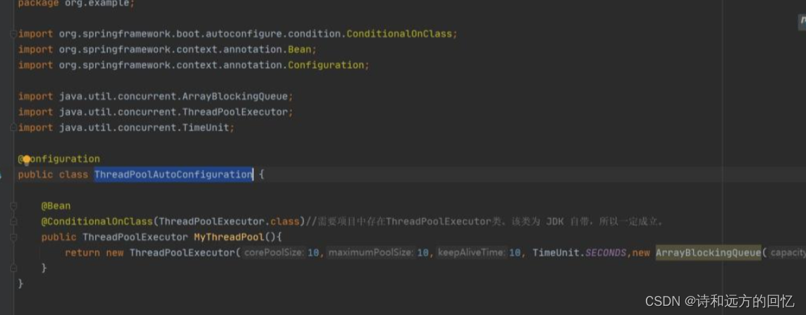 @Configuration表示该类是个配置类,@Bean表示该方法返回一个 Bean。这样就把TestService作为 Bean 让 Spring 去管理了,在其他地方,我们如果需要使用该 Bean,和原来一样,直接使用@Resource注解注入进来即可使用,非常方便。@Resource private TestService testService;