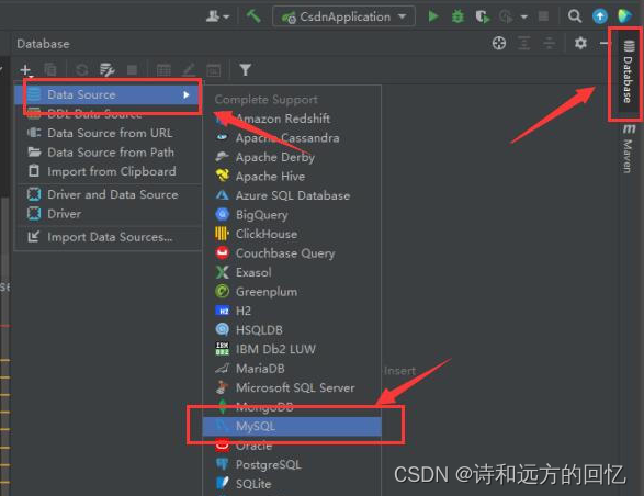 回到IDEA,将IDEA右边侧栏的Database点开,添加MySQL数据库