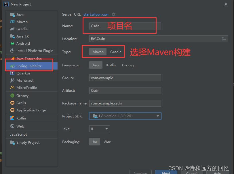 在IDEA工具点击New Project,进入下面界面点击Spring initializr选项,根据以下图中提示填写信息