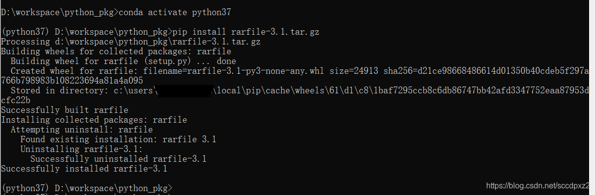 步骤2:进入目录D:\workspace\python_pkg,执行命令pip install rarfile-3.1.tar.gz,如下图: