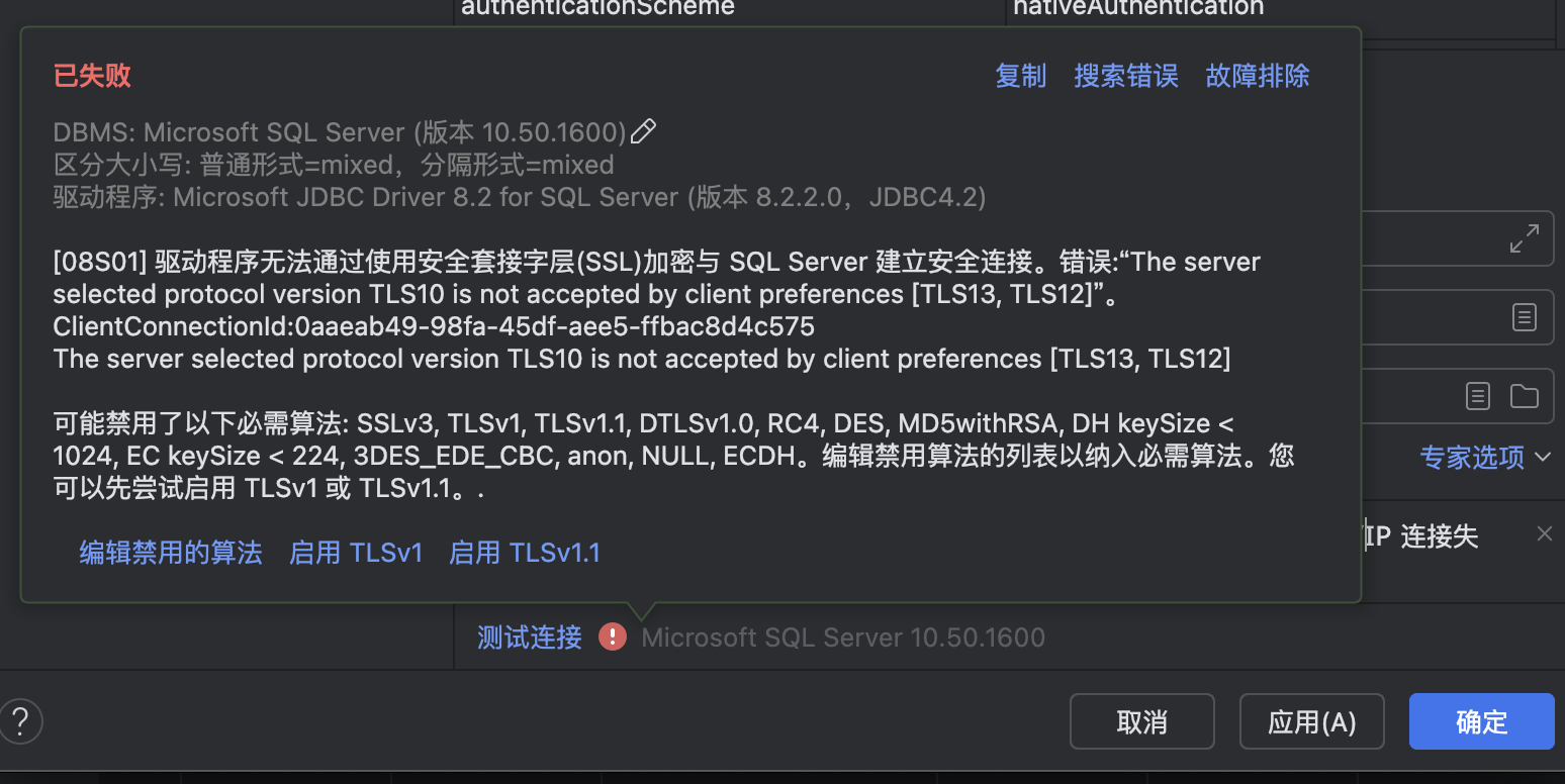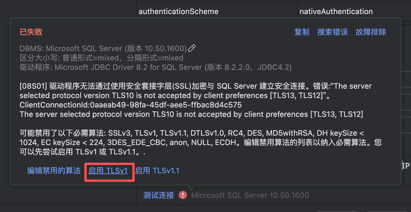 [08S01] 驱动程序无法通过使用安全套接字层(SSL)加密与 SQL Server 建立安全连接。错误:“The server selected protocol version TLS10 is not accepted by client preferences [TLS13, TLS12]”。 ClientConnectionId:837d4f63-149f-4b26-8362-0b5dbacc88cf
