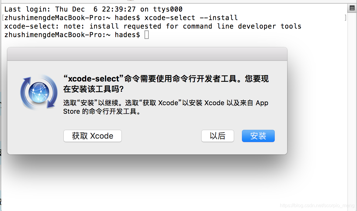 3,执行xcode-select --install 即可,弹出页面中,点击“安装”