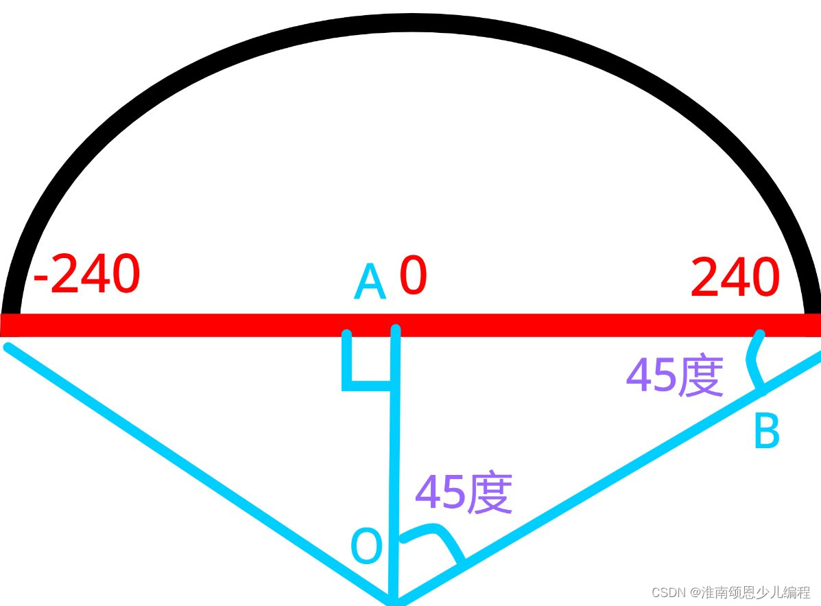 第二步,确定彩虹的圆心,遵循等均分布和规整美观的原则,确定圆心角为90°;这样则有角1,角2均等于45°的推理,即三角形AOB为等腰直角三角形。