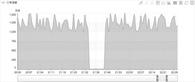 除了系统自身监控,很多系统故障和性能问题会直接反应到业务上。如果系统响应缓慢甚至宕机,那么实时订单量也会受到影响,因此监控实时交易也可以发现系统问题。图6是实时交易监控图,在这里例子中,21:33订单量突然降到零,虽然系统监控指标正常,但是可以断定系统必定出了问题,马上打开应用日志查看,发现有个Bug导致某个外部资源死锁,立刻手工释放该资源,系统恢复正常。