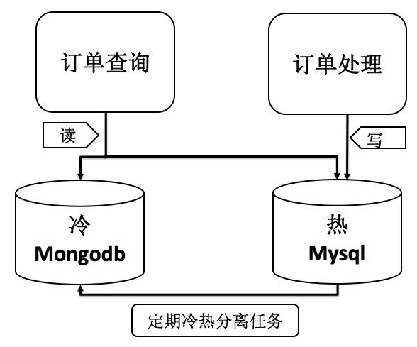 一开始我们考虑使用分布式数据库的方案,对订单表进行水平切分,使用订单号进行hash,将订单数据切分到多张表上。 进一步分析后发现,订单数据具有明显的冷热不均的特点,即刚刚创建的订单是热数据,不同应用以各种方式访问修改这些订单。经过一段时间以后,特别是订单完成后,订单访问频率急剧降低,而且只有订单查询这一种操作。于是我们考虑采取冷热数据分离的策略,以控制热库中数据总量,保障订单表数据量始终维持在一个可以接受的范围内,进而提供稳定的数据访问性能。订单数据冷热分离方案如图5。