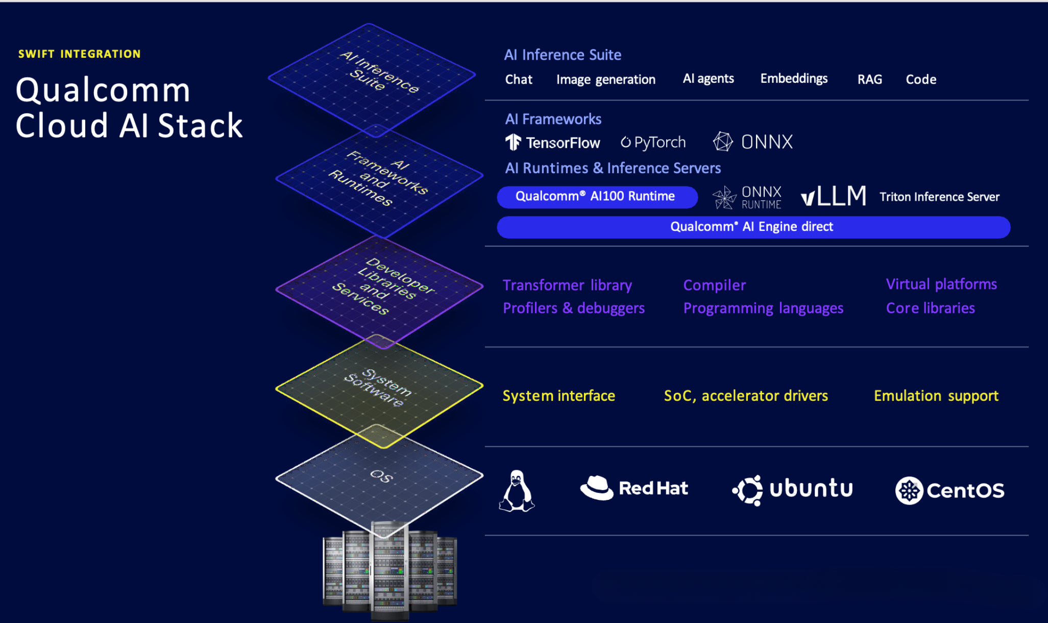 高通技术公司生态系统的成员已经开始帮助客户基于该解决方案进行内部部署。如下所示,高通技术公司提供技术栈的底层,为原始设备制造商 (OEM)、原始设计制造商 (ODM)、系统集成商 (SI) 和软件供应商在上层增值留出了充足的空间。