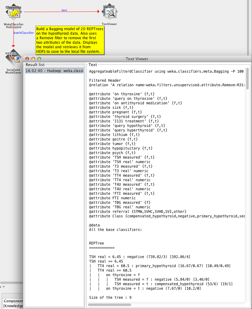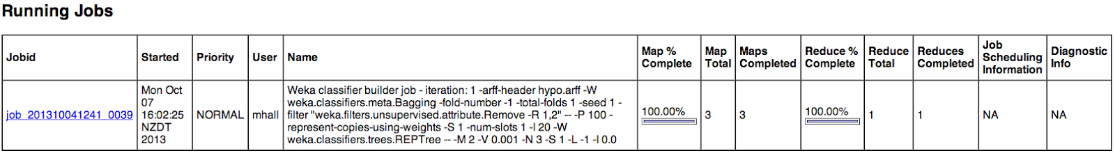 java weka.distributed.hadoop.WekaClassifierEvaluationHadoopJob \ -hdfs-host 192.168.22.240 -hdfs-port 9000 \ -jobtracker-host 192.168.22.240 -jobtracker-port 9001 \ -input-paths /users/mhall/input/kdd99 \ -output-path /users/mhall/output \ -header-file-name kdd99.arff -max-split-size 50000000 \ -randomized-chunks -num-chunks 15 \ -W weka.classifiers.meta.Bagging -total-folds 10 \ -num-nodes 10 -logging-interval 5 \ -user-prop mapred.child.java.opts=-Xmx1200m \ -- -W weka.classifiers.trees.RandomTree -I 200 \ -- -depth 3 -K 3