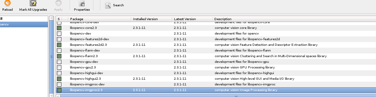 在synaptic搜索opencv , 下载libopencv-dev 即可。