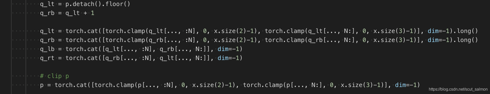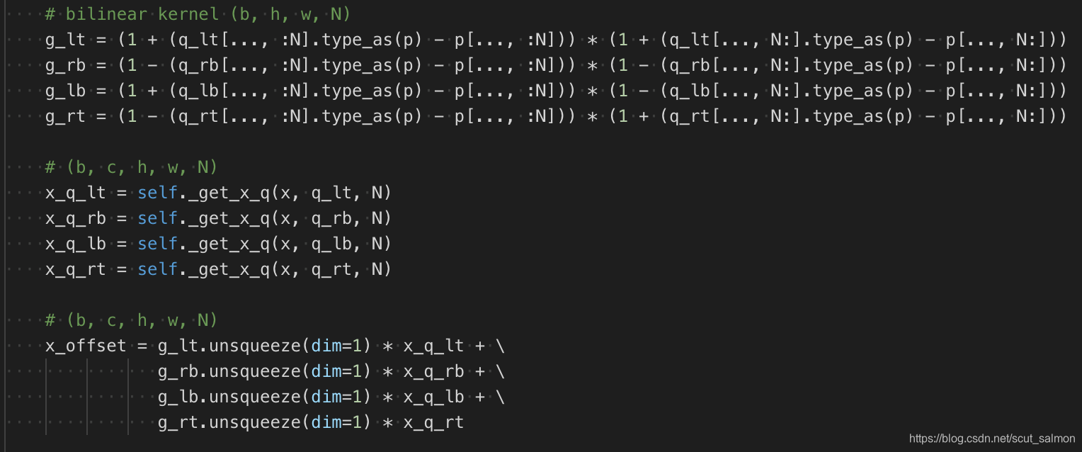 得到的偏移坐标p肯定没有对应的原始像素值,所以要做一个双线性内插,双线性内插参考https://zh.wikipedia.org/wiki/%E5%8F%8C%E7%BA%BF%E6%80%A7%E6%8F%92%E5%80%BC。双线性内插输入的四个点来自周围的四个点,四个点的面积是1,所以四个内插权重得到一定的简化: