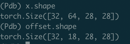 这一步输入图片学习偏移量offset,输入的feature map尺寸是(64,28,28)分别表示通道数,h和w。输出之所以是18通道的,是因为kernel size是3,卷积核有3*3=9个点,每个点都有x偏移量和y偏移量(从这里看得出每个输入通道做同样的偏移处理),18通道的前九个通道表示x偏移量,后9个通道表示y偏移量。