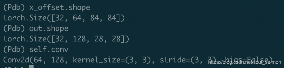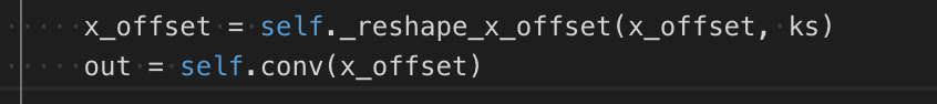 注意执行_reshape_x_offset函数前x_offset的形状是torch.Size([32, 64, 28, 28, 9]),由于dcn的卷积核是3*3,所以感受野里总共9个元素(这也是最后一个通道是9点原因),reshape之后把9维向量的感受野展开成平面(torch.Size([32, 64, 84, 84])),而且由于self.conv的stride等于kernel size,所以卷积过程没有重叠,恰好是我们需要的卷积。