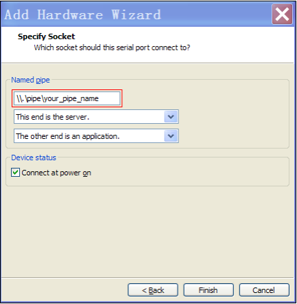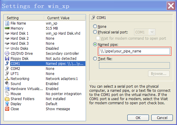 在Virtual PC 中,命名管道的配置如下面的图所示: