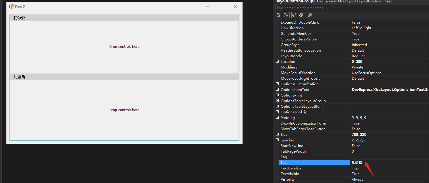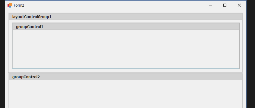 4、可以看到拖拽上去之后控件直接覆盖了整个窗体,后面再托GroupControl控件就会产生影响,设置下他的尺寸。