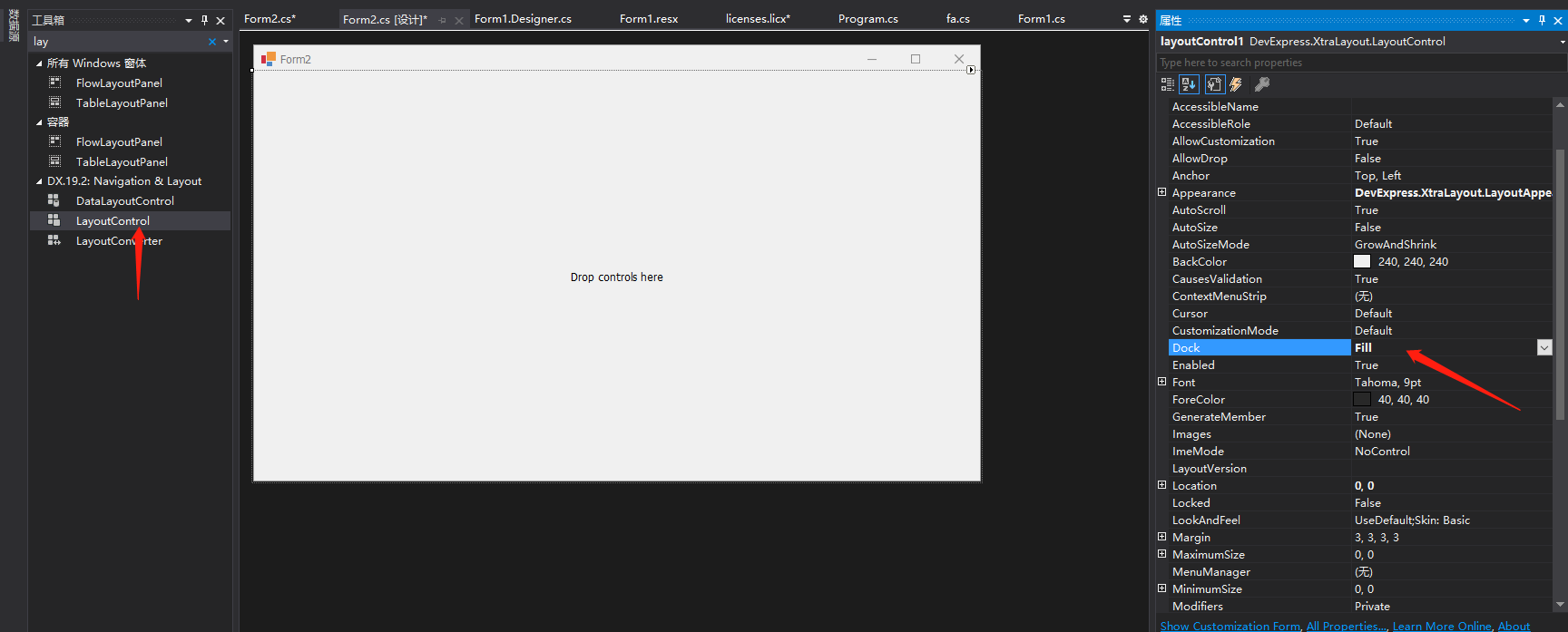 2、找到LayoutControl控件并拖拽到窗体上,属性Dock设置为Fill