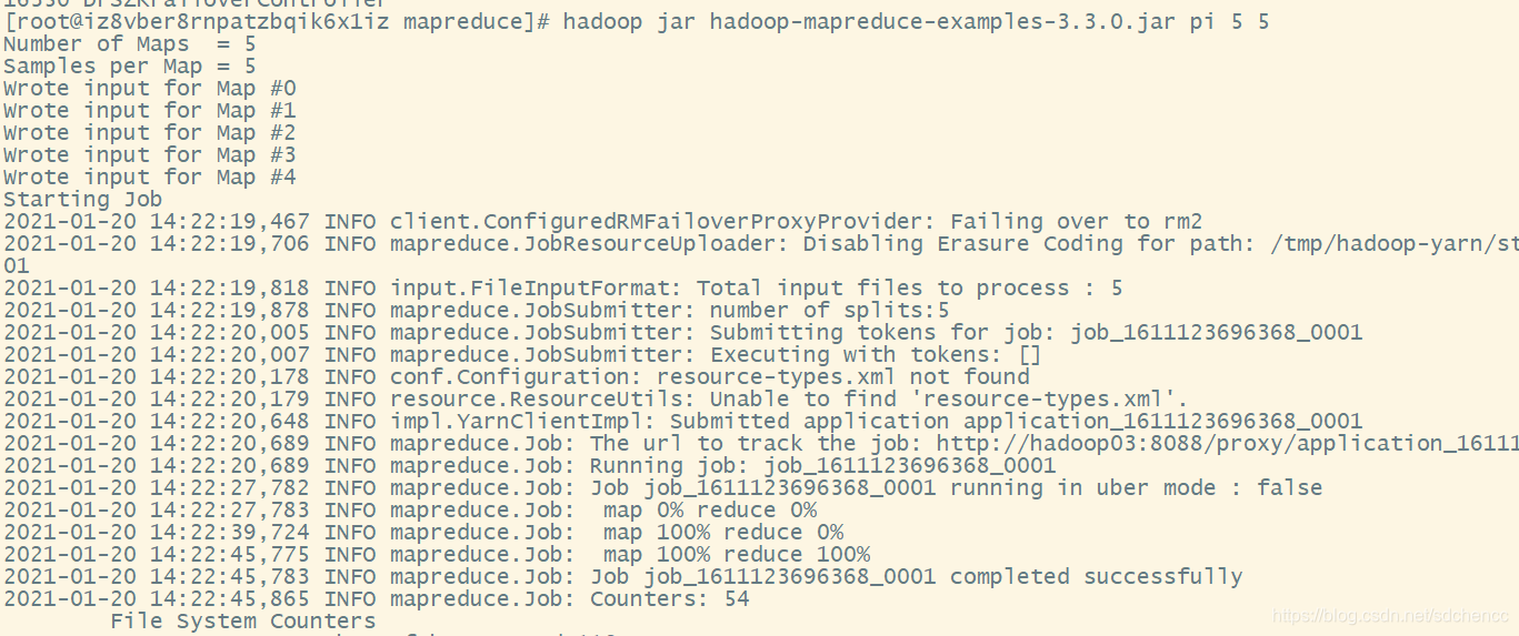 hadoop jar hadoop-mapreduce-examples-3.3.0.jar pi 5 5