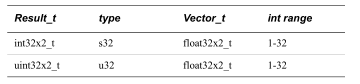 4. Result_t vmovn_type(Vector_t N); 将四字向量的每个元素的最低有效一半复制到双字向量的相应元素中。s16转s8,s32转s16,s64转s32,u16转u8,u32转u16,u64转u32
