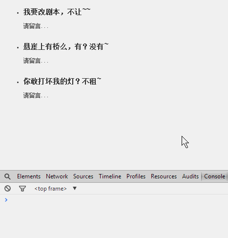 <!DOCTYPE HTML PUBLIC "-//W3C//DTD HTML 4.01 Transitional//EN" "http://www.w3.org/TR/html4/loose.dtd"><html><head> <title></title> <script type="text/javascript" src="jquery-1.8.3.js"></script> <script type="text/javascript" src="PlaceFieldEditor.js"></script> <script type="text/javascript" src="com.zhy.extend.utils.js"></script> <script type="text/javascript" src="PlaceAreaEditor.js"></script> <script type="text/javascript"> $(function () { $("ul li div").each(function () { new PlaceAreaEditor($(this).attr("id"), "请留言...", $(this)); }); }); </script> <style type="text/css"> body { font-size: 12px; color: #333;; } ul li { padding: 5px 0 8px 0 ; } </style></head><body><ul> <li id="1"><h3>我要改剧本,不让~~</h3> <div> </div> </li> <li id="2"><h3>悬崖上有桥么,有?没有~ </h3> <div> </div> </li> <li id="3"><h3>你敢打坏我的灯?不租~ </h3> <div> </div> </li></ul></body></html>