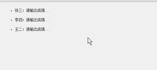 <!DOCTYPE HTML PUBLIC "-//W3C//DTD HTML 4.01 Transitional//EN" "http://www.w3.org/TR/html4/loose.dtd"><html><head> <title></title> <script type="text/javascript" src="jquery-1.8.3.js"></script> <script type="text/javascript" src="PlaceFieldEditor.js"></script> <script type="text/javascript"> $(function () { $("ul li").each(function () { new PlaceFieldEditor($(this).attr("id"), "请输出成绩...", $(this)); }); }); </script> <style type="text/css"> body { font-size: 12px; color: #333;; } ul li { line-height: 30px; } </style></head><body><ul> <li id="1">张三:</li> <li id="2">李四:</li> <li id="3">王二:</li></ul></body></html>嗯,代码就不详细说了,都比较简单,使用了jQuery,如果不喜欢可以使用原生js,本人比较喜欢把jQuery当作js的工具使用。