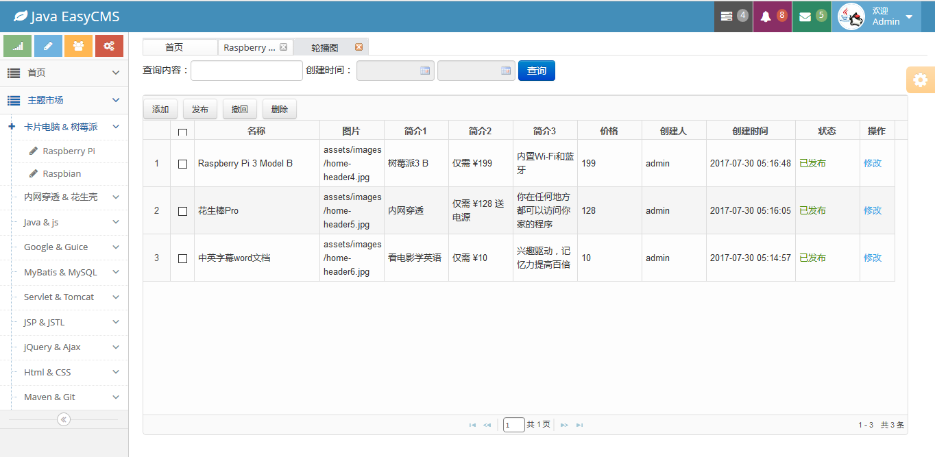 Java EasyCms 使用最简单性能最高的框架,将cms系统简单到极致,灵活的栏目扩展,快速的构建普通网站 生成的静态演示站(测试): www.j4cms.com