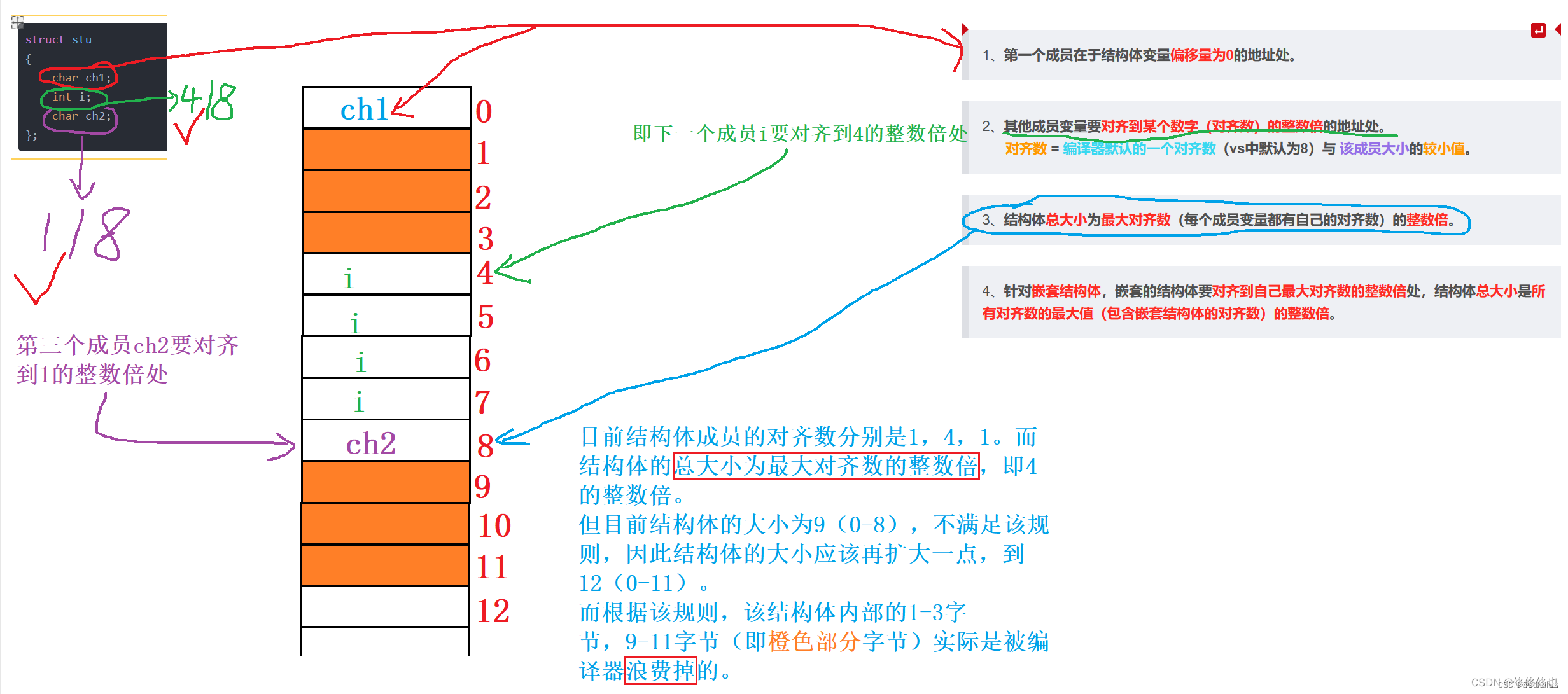 为了提高内存访问的效率,编译器会对结构体进行对齐。对齐的方式是按照成员的类型和顺序来进行的。