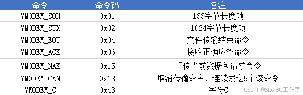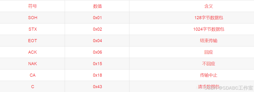 YModem的传输过程就是上面所示。但是上面传输过程中存在许多通信信号,它们的数值与意义如下表所示:
