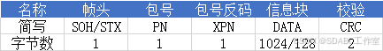 【1】以SOH(0x01)开始的数据包,信息块是128字节,该类型帧总长度为133字节。