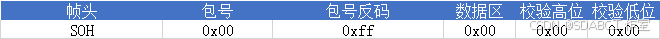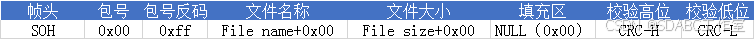 Ymodem起始帧并不直接传输文件内容,而是先将文件名和文件大小置于数据帧中传输;起始帧是以SOH 133字节长度帧传输,格式如下。