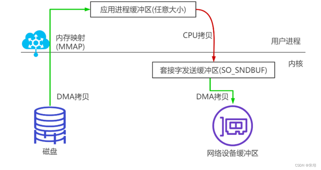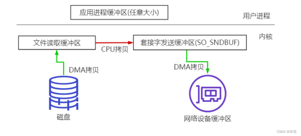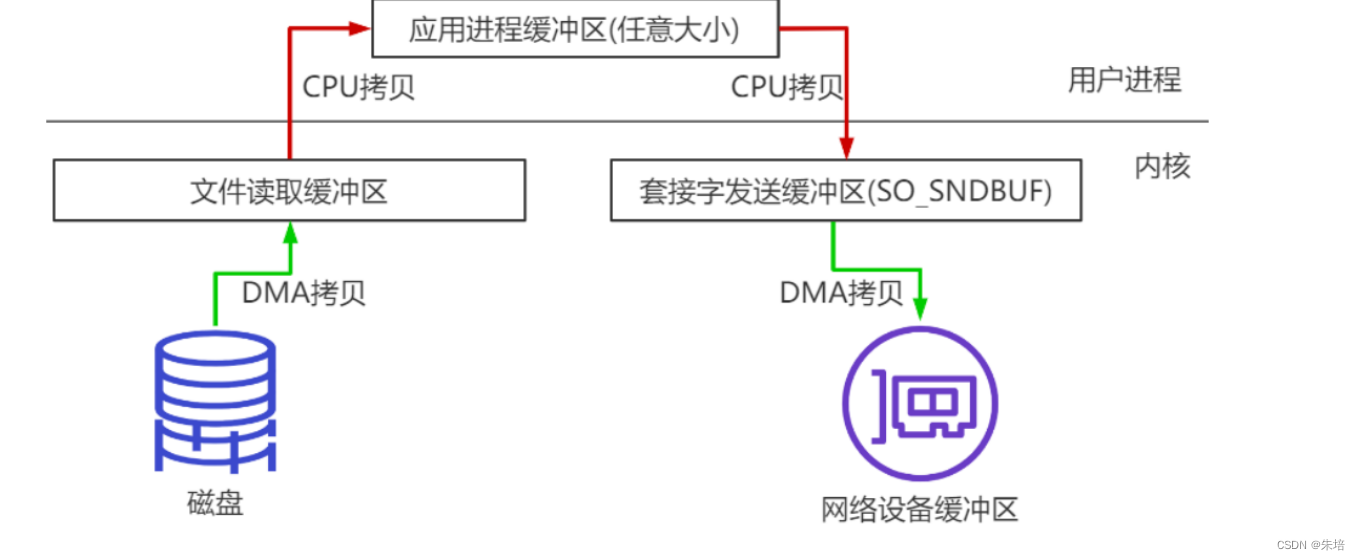 - 会存在4次磁盘拷贝。传统的数据传送所消耗的成本:4次拷贝,4次上下文切换。4次拷贝,其中两次是DMA copy,两次是CPU copy。第二次和第三次数据copy 其实在这种场景下没有什么帮助反而带来开销,这也正是零拷贝出现的背景和意义。
