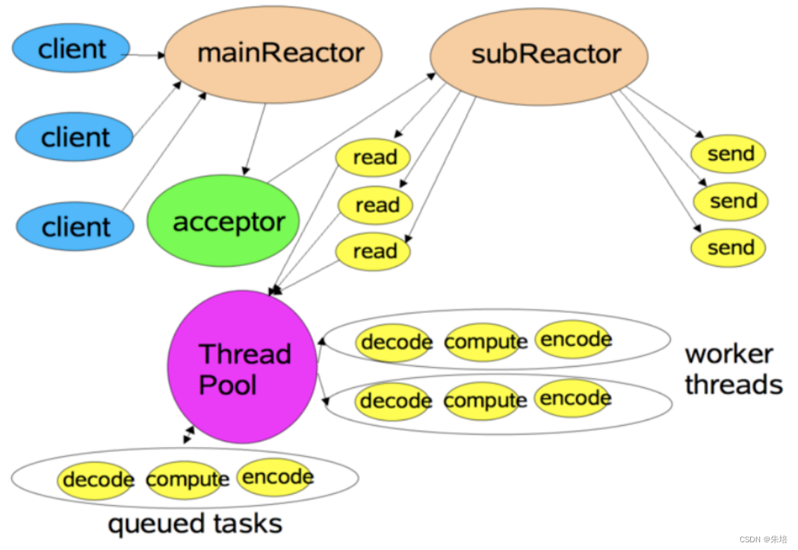工作流程图。BossGroup专门负责接收客户端的连接, WorkerGroup专门负责网络的读写。主要的4个元素:Acceptor处理 client 的连接,并绑定具体的事件处理器;Event具体发生的事件,比如图中s的read、send等;Handler执行具体事件的处理者,比如处理读写事件的具体逻辑;Reactor将具体的事件分配(dispatch)给 Handler。