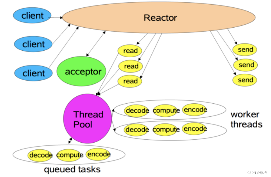 添加了一个工作者线程池,并将非I/O操作从Reactor线程中移出转交给工作者线程池来执行。