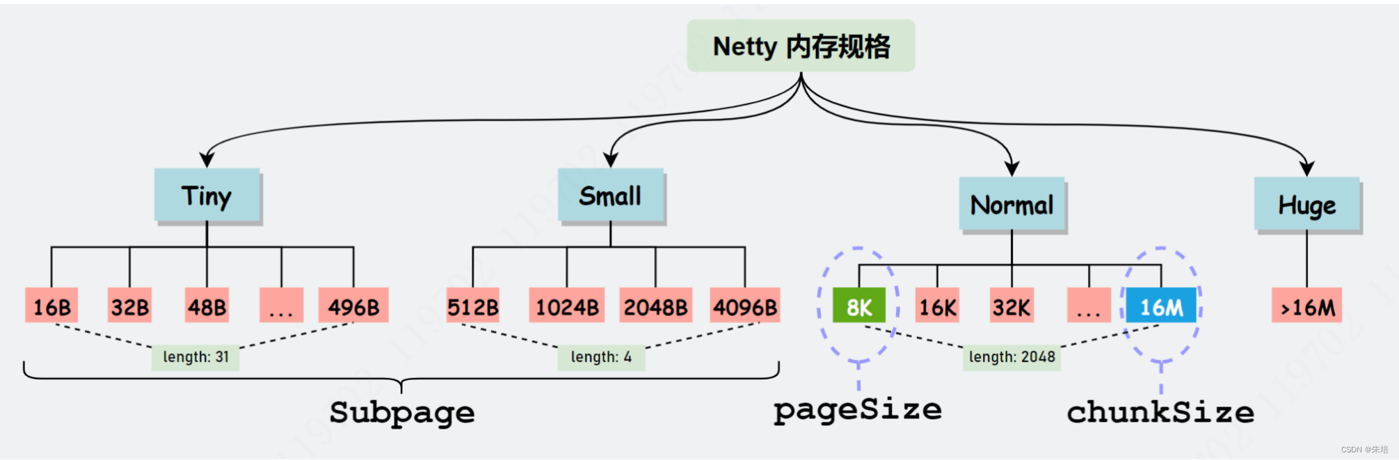 Netty 对内存大小划分为:Tiny、Small、Normal 和 Huge 四类。对于大于 16MB 的内存定义为 Huge 类型,大型内存不做缓存、不做池化,直接以 Unpool 的形式分配内存,用完后回收。Normal 级别分配的大小范围是 [4097B, 16M)一个 small的范围是(496B, 4096B],有且只有四种大小: 512B、1024B、2048B 和 4096B,以 2 倍递增。