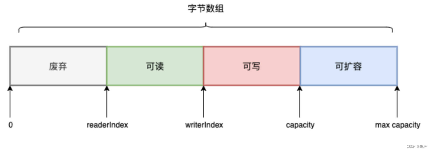 当从 ByteBuf 读取时,它的 readerIndex(读索引)将会根据读取的字节数递增。 同样,当写 ByteBuf 时,它的 writerIndex 也会根据写入的字节数进行递增。每读取一个字节,readerIndex递增1;直到readerIndex等于writerIndex,表示ByteBuf已经不可读;每写入一个字节,writerIndex递增1;直到writerIndex等于capacity,表示ByteBuf已经不可写;当writerIndex等于capacity表示底层字节数组需要扩容,且最大扩容不能超过max capacity。