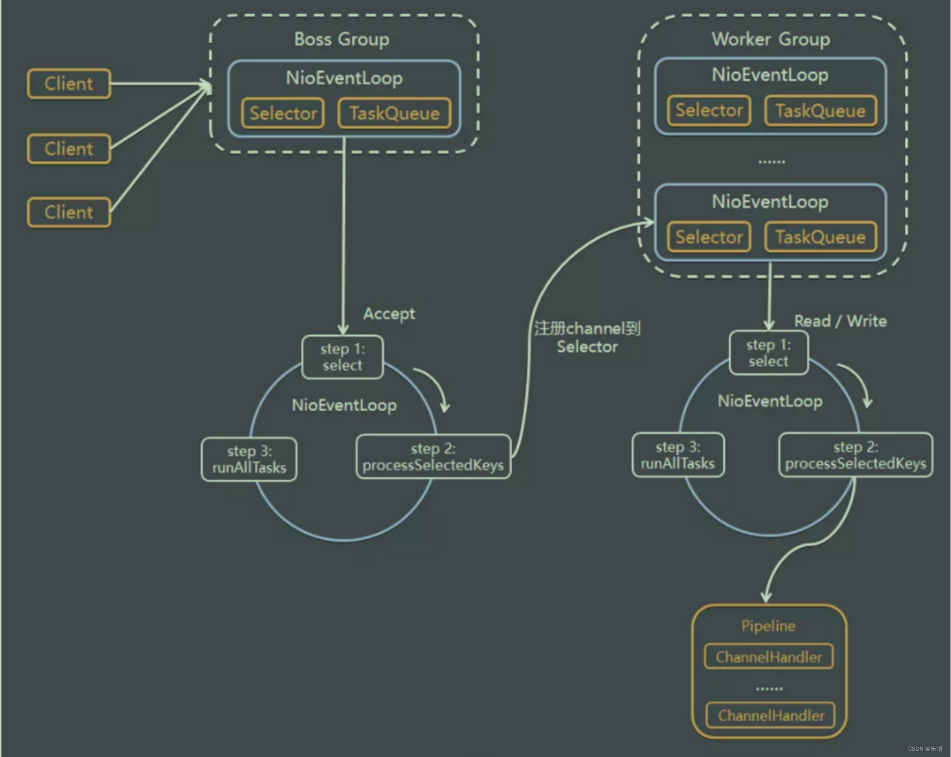 - 每个Boss NioEventLoop线程内部循环执行的步骤有 3 步 :处理accept事件 , 与client 建立连接 , 生成 NioSocketChannel 将NioSocketChannel注册到某个worker NIOEventLoop上的selector 处理任务队列的任务 , 即runAllTasks