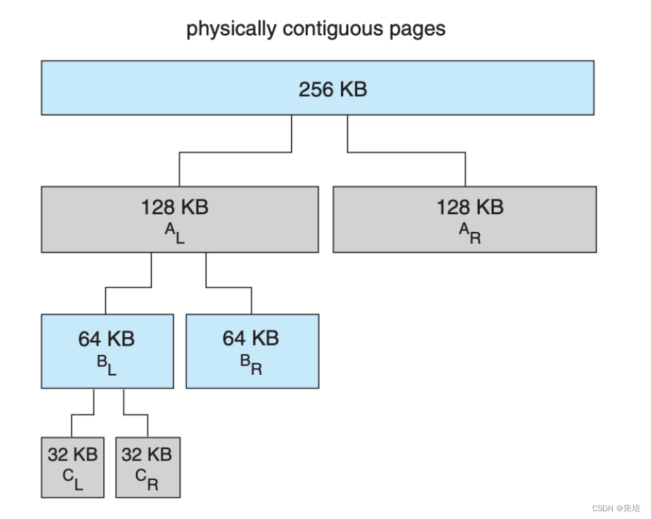 假设,一个最初由256KB的物理内存。假设申请21KB的内存,内核需分片过程如下:内核将256KB的内存进行分割,变成两个128KB的内存块,AL和AR,这两个内存块称为伙伴。随后他发现128KB也远大于21KB,于是他继续分割为两个64KB的内存块,发现64KB 也不是满足需求的最小的内存块,于是他继续分割为两个32KB的。32KB再往下就是16KB,就不满足需求了,所以32KB是它满足需求的最下的内存块了,所以他就分割出来的CL 或者CR 分配给需求方。